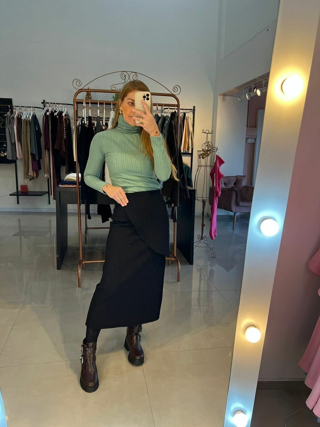 Tecido flexivel: Feita em uma malha com um canelado bem sutil, um tecido maleável e confortável, a saia se adapta bem ao corpo, proporcionando liberdade de movimentos. Composição 96%viscose 4%elastano
